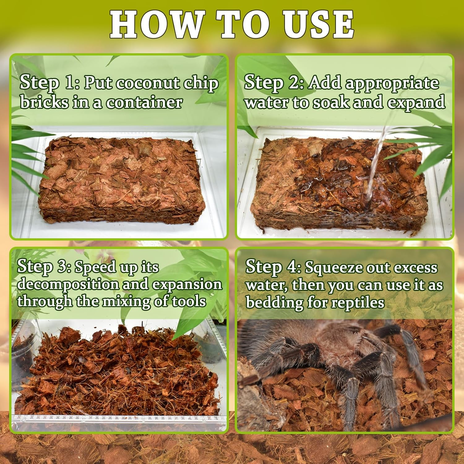 - What You Will Receive: You will get 6 PCS in 1.1 LB compressed coco coir chip brick. It will expand into loose coco chips after water absorption, each loose coco chips is about 10 mm~35 mm, which is an ideal coconut substrate for reptiles