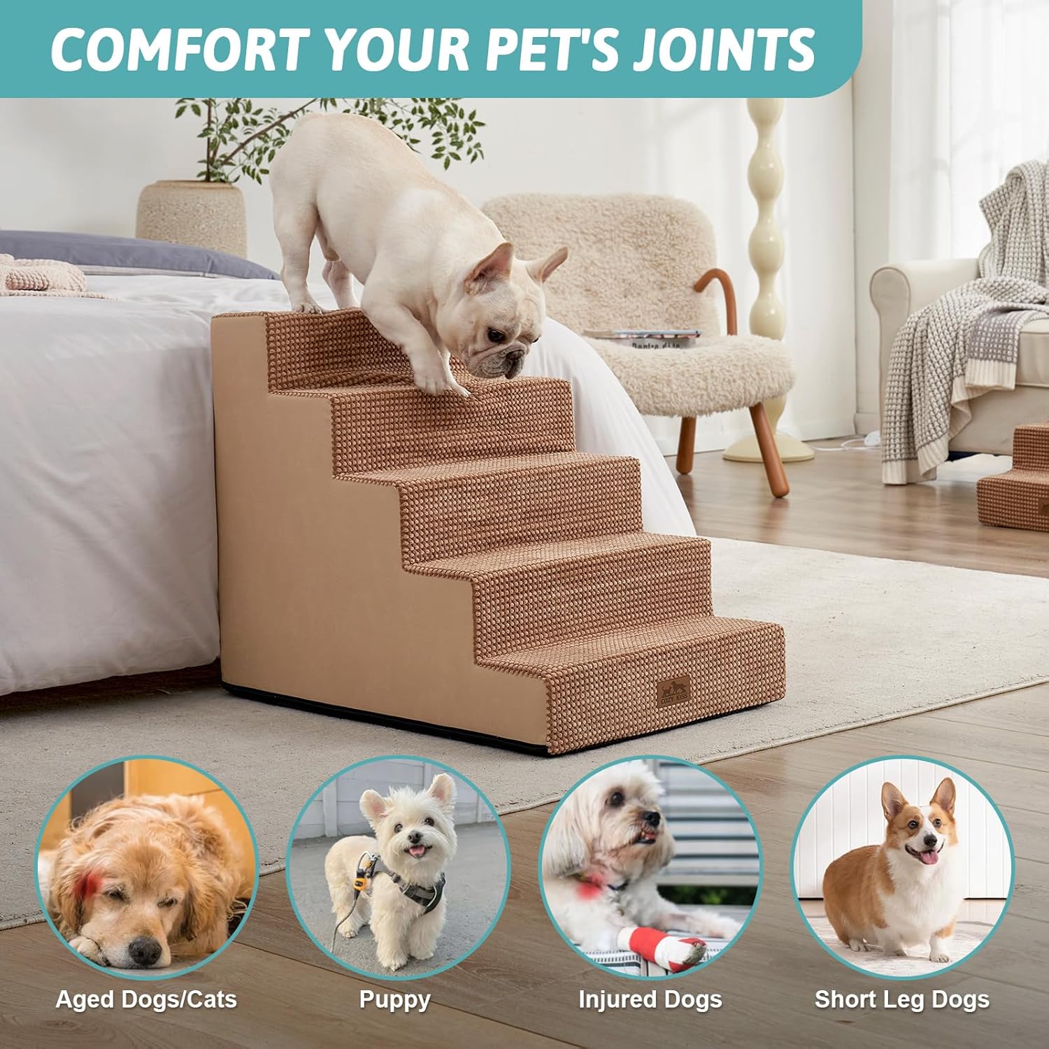 - Widened Pet Stairs: The dog steps feature a widened design 4 inches broader than standard dog stairs, offering enhanced stability while accommodating the needs of small and medium dogs, the extra width provides a safer climbing space for pets. With 5 tiers of height, it allows your pet to reach elevated areas easily
