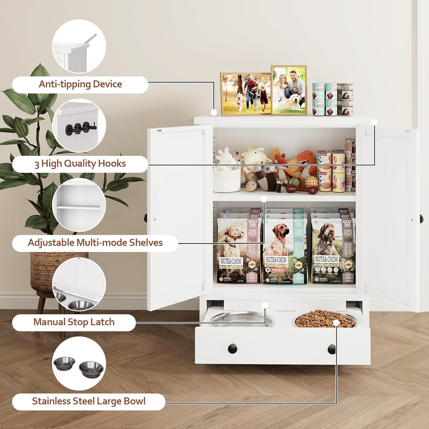 Dog Feeding Station with Storage, Metal Dog Food Storage Cabinet with 2 Elevated Bowls and 3 Hooks, Pet Feeding Station and Dogs Food Storage Organizer, White