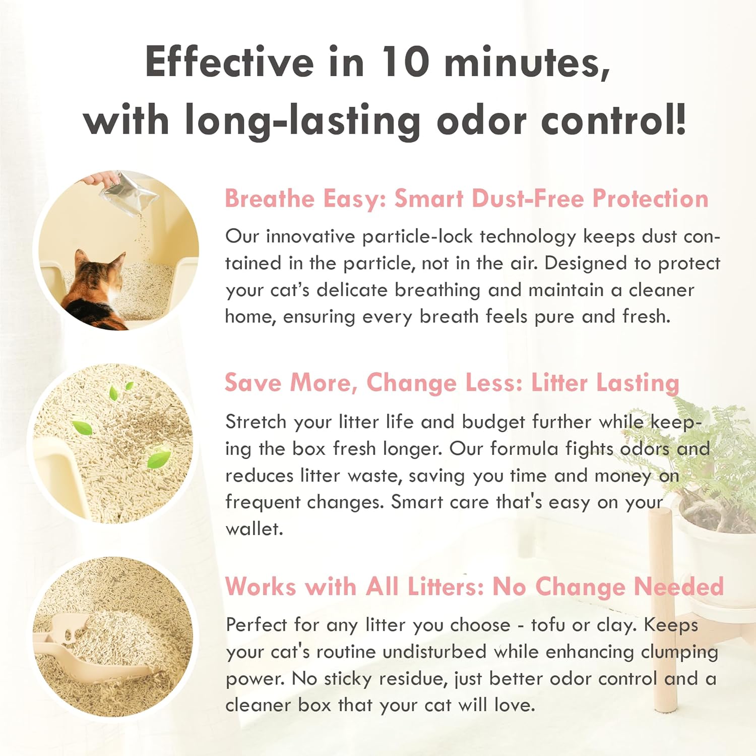 • Long-Lasting Freshness, Less Waste – Each 10g packet refreshes 6 to 9 lbs of litter, extending its lifespan and reducing waste. Use more if necessary for litters with poor odor control.