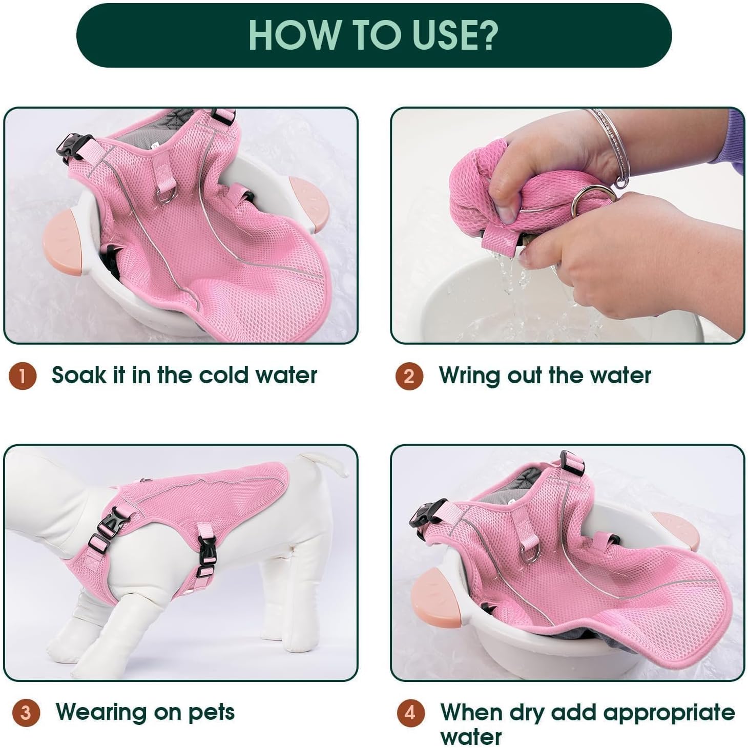 • HOW TO USE: Simply soak the cooling undershirt in cold water, wring it out and put it on your dog. As the vest gradually evaporates, it lowers your dog's body temperature and provides a soothing cooling effect. By using this cooling vest, you can greatly reduce your dog's risk of elevated temperatures and heat-related problems