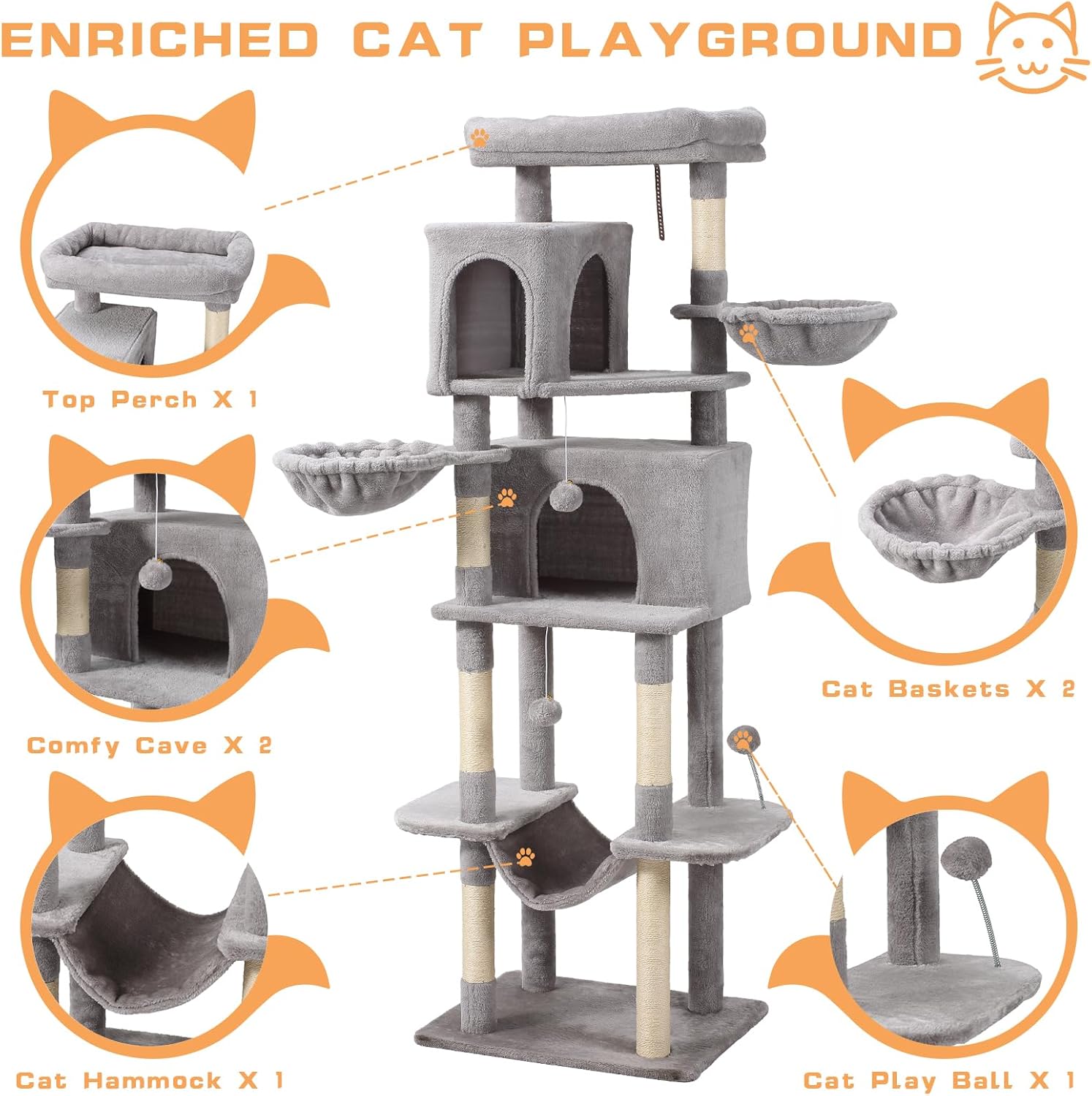 - [Play space for Lagre Cats]Configured with multi-level platforms, Cat Condos, scratching boards and hammocks to satisfy their jumping instincts and provide diverse activity areas.
