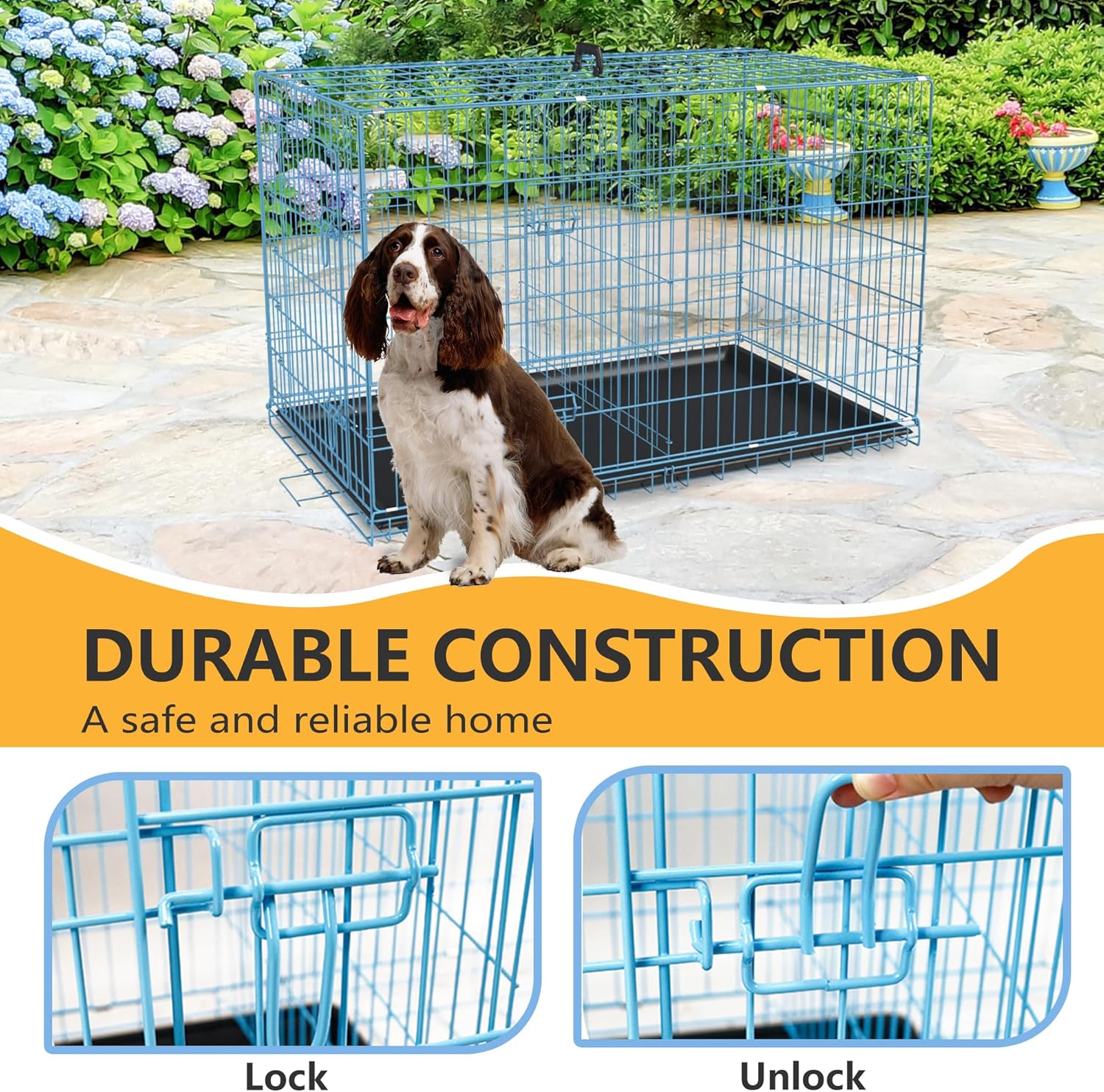 FDW Dog Crate for Medium Dogs 36 Inch Folding Metal WirePet Cage Double Door W/Divider Panel Indoor Outdoor Kennel Leak-Proof Plastic Tray,Blue