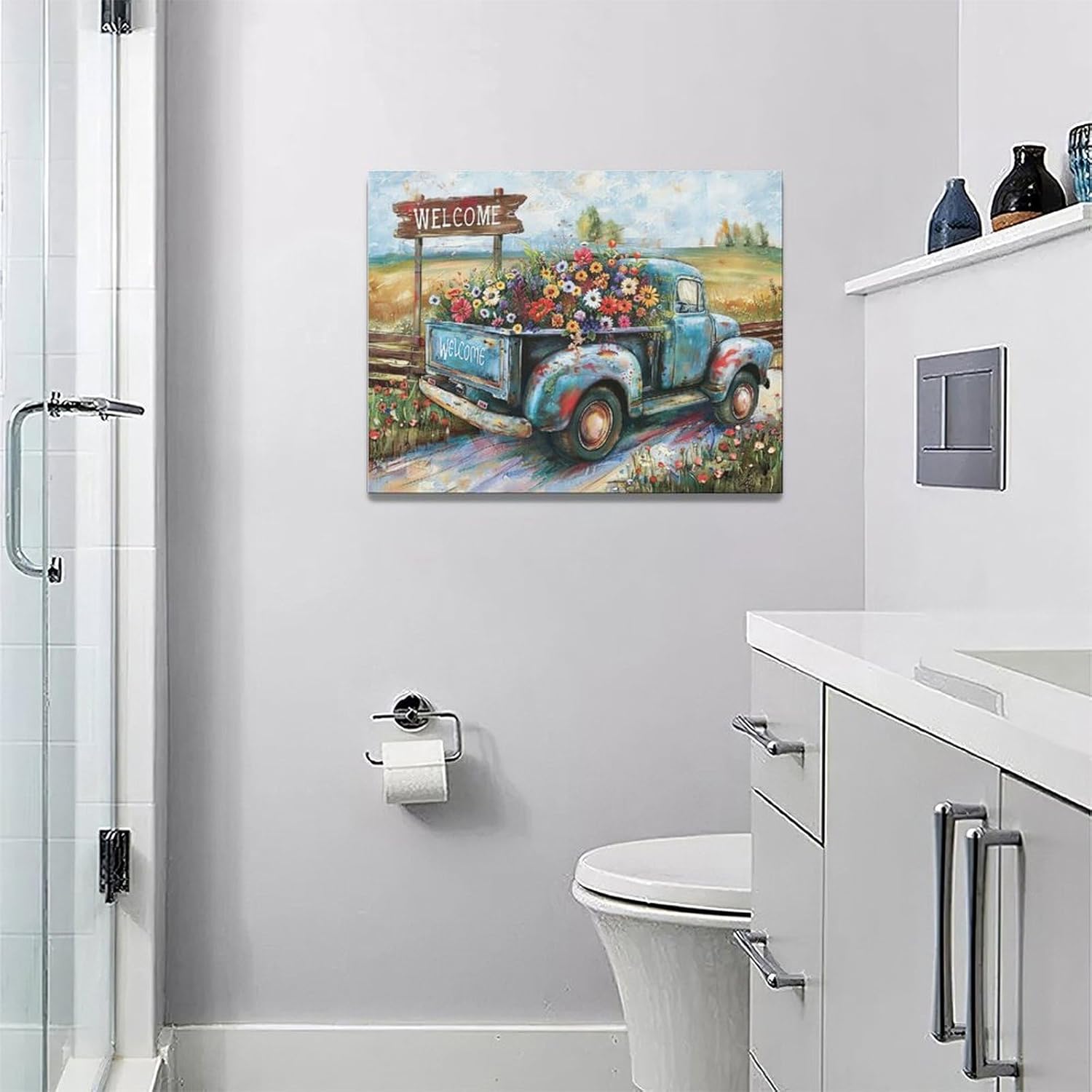 Farmhouse Truck Wall Art Rustic Country Wildflowers Wall Decor Road Flowers Landscape Pictures Canvas Print Painting Artwork for Bathroom Living Room Bedroom 12"x16"