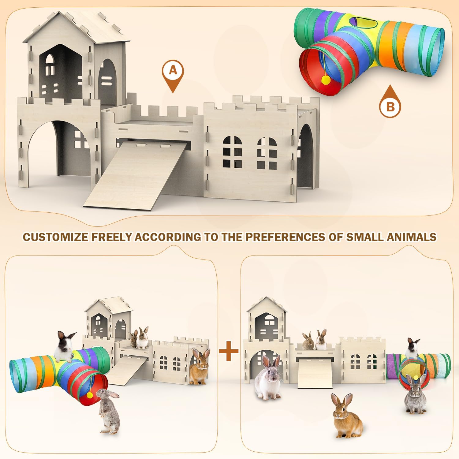 - Versatile Rabbit Hideout for Indoor and Outdoor Use:Whether indoors or outdoors, our rabbit houses and hideouts are versatile enough to suit any environment. The detachable bunny tunnel and easy-to-clean design make it a practical choice for all bunny owners.