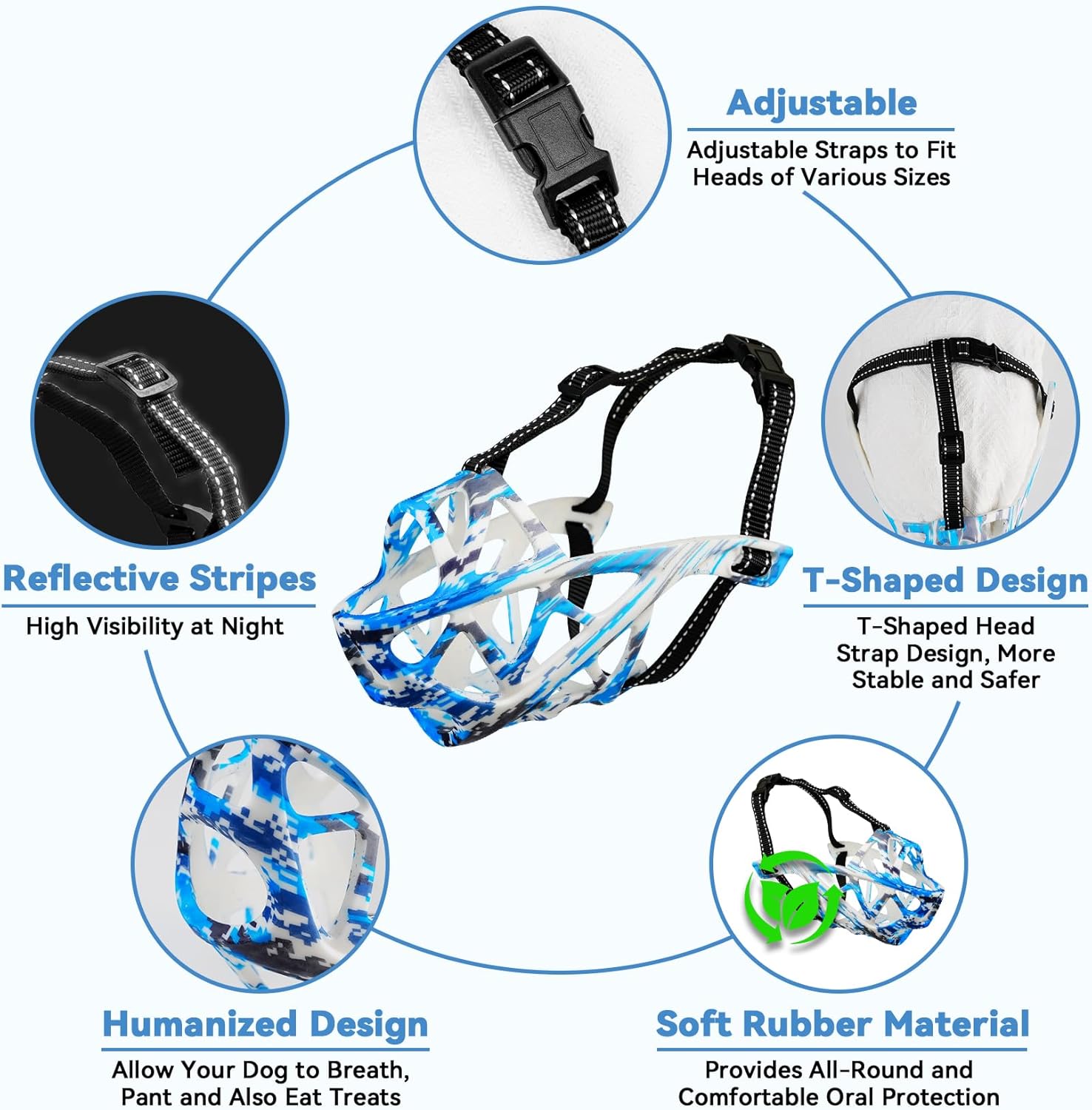 • Easy to Put on and Remove: Designed for Convenience, The Adjustable Straps on Our Dog Muzzle Allow for Quick and Secure Fitting. The Ergonomic Design Ensures a Hassle-Free Experience for Both You and Your Dog, Making it Ideal for Daily Walks, Training Sessions, Or Visits to the Vet. Reflective Strap Design Provides Night Travel Safety