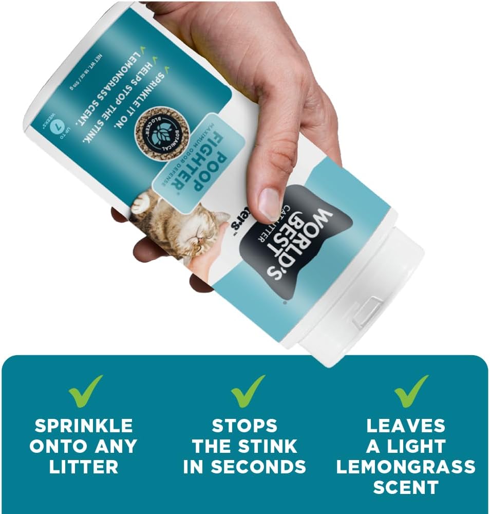 • ELIMINATES ODORS: World’s Best Cat Litter Boosters Poop Fighter is a natural and sustainable cat litter additive that helps eliminate poop, urine, and ammonia odors, not just mask them. Simply sprinkle it on to your usual litter for a deodorized litter box.