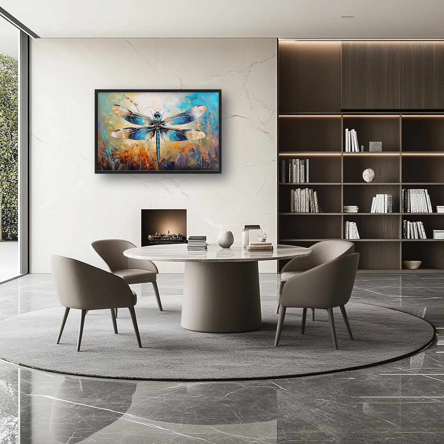 - 【Unique Design】A blue dragonfly with wings spread wide, in the style of an oil painting, in the background is an autumn field with rich, bright, and vivid colors, and an oil painting texture with visible brushstrokes. The close-up shots capture the warm tones and natural light, highlighting the details of the dragonfly's body and textures, creating a strong contrast between dark and light.