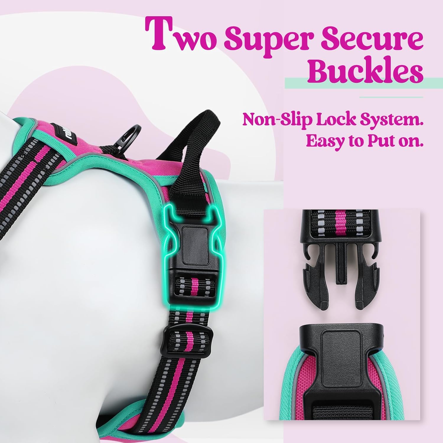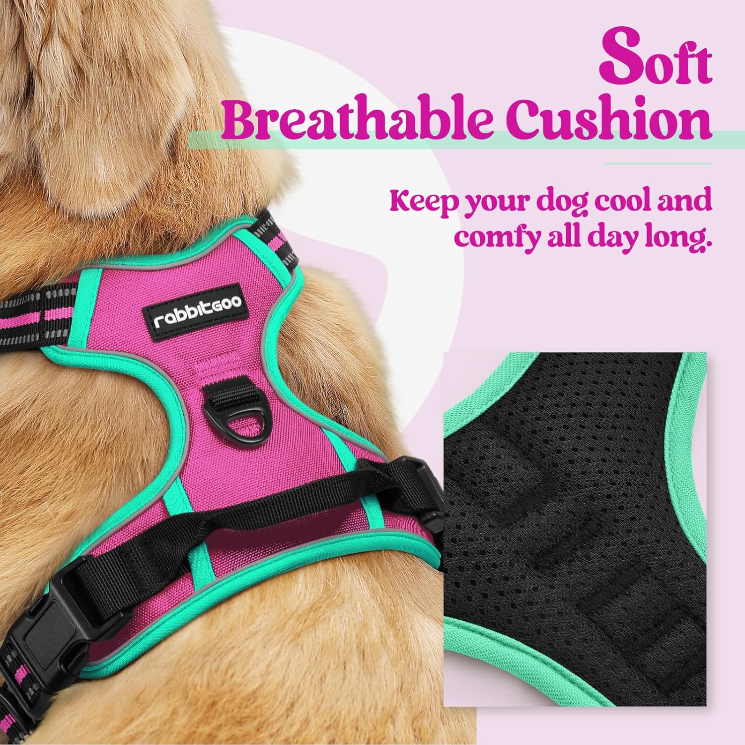rabbitgoo Dog Harness No Pull with 2 Leash Clips, Adjustable Soft Padded, Reflective Oxford No Choke Pet Vest with Easy Control Handle for Large Dogs, Hot Pink & Turquoise, XL