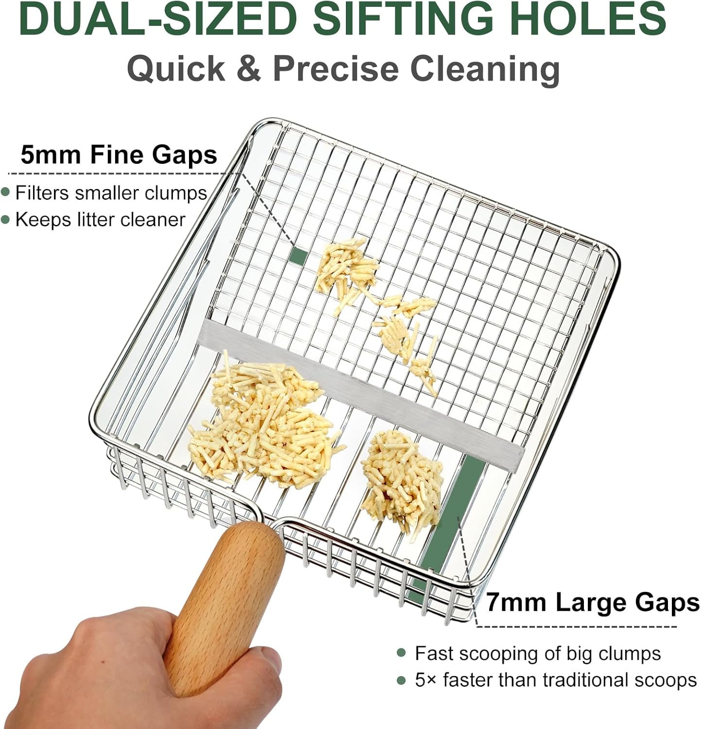 - One Scoop for Two Purposes, Faster Sifting: This metal cat litter scoop features a fine grid design at the front end to capture fine particles and cat waste accurately, while the wide-slit design at the back end easily scoops up larger waste pieces. This allows for efficient cleaning and recycling. Itβs a nice cat scooper for litter box
