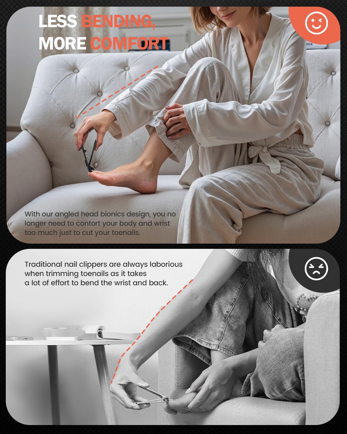 - LESS BENDING, MORE COMFORT - We understand the importance of comfort and convenience, especially for elderly individuals. Our ergonomic toenails clipper for seniors fits comfortably in your hand, ensuring a secure grip and reducing strain on your wrist. With this thick nails clipper's innovative angled head bionics design, you no longer need to contort your body just to cut your toenails.