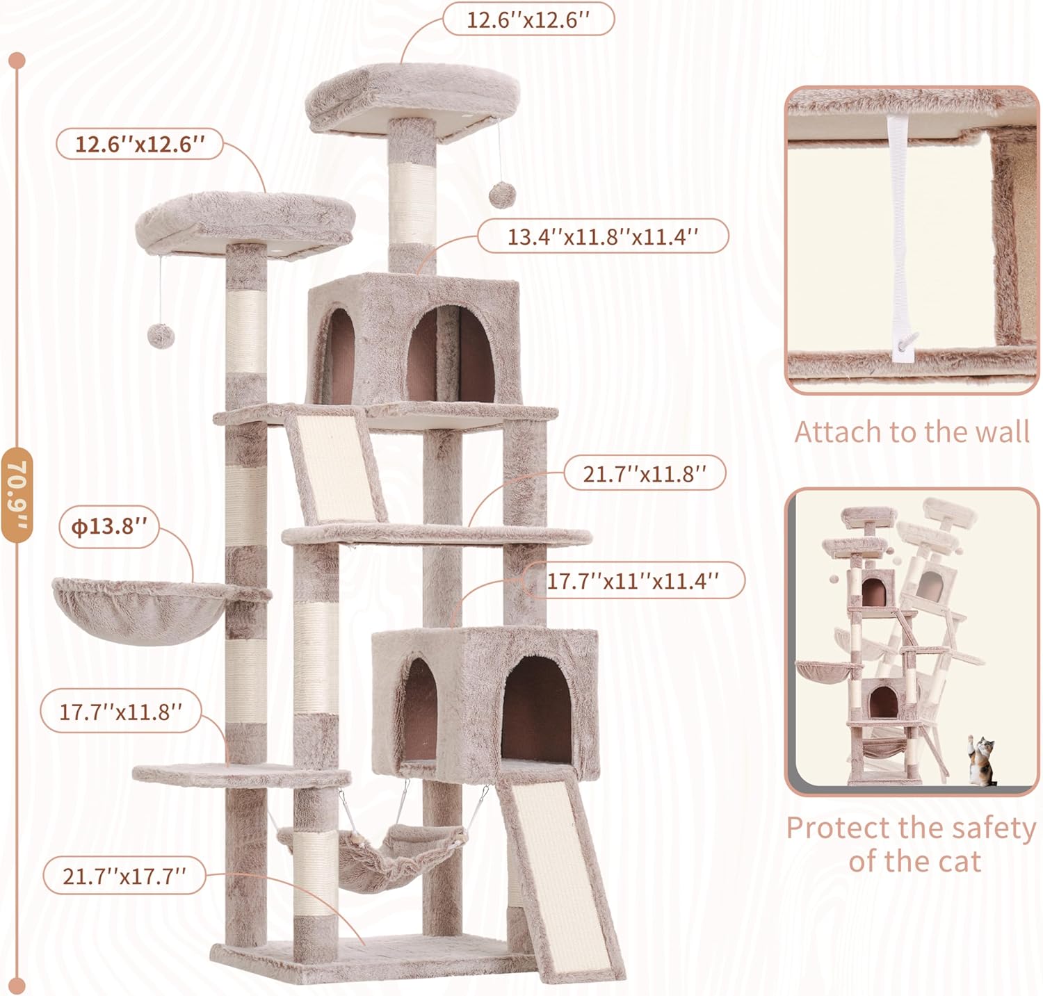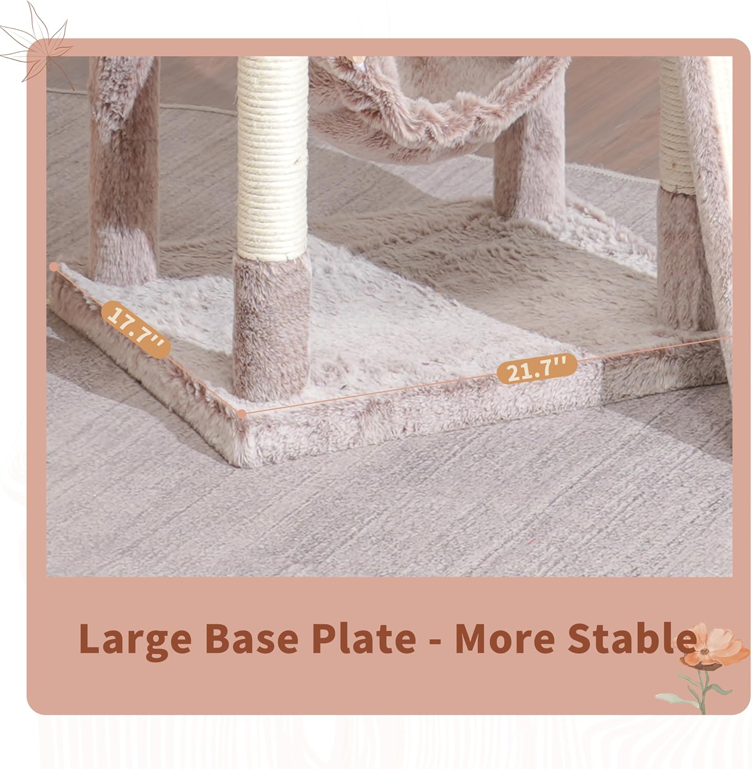 • Large Base, More Sturdy: The spacious base(21.7''L x 17.7''W) provides excellent stability. Additionally, the included anti-tipping straps can be used to secure this cat tree to the wall. Even when adult cats or large cats climb up and down, it is not easy for the cat tree to tip over, making it much safer.