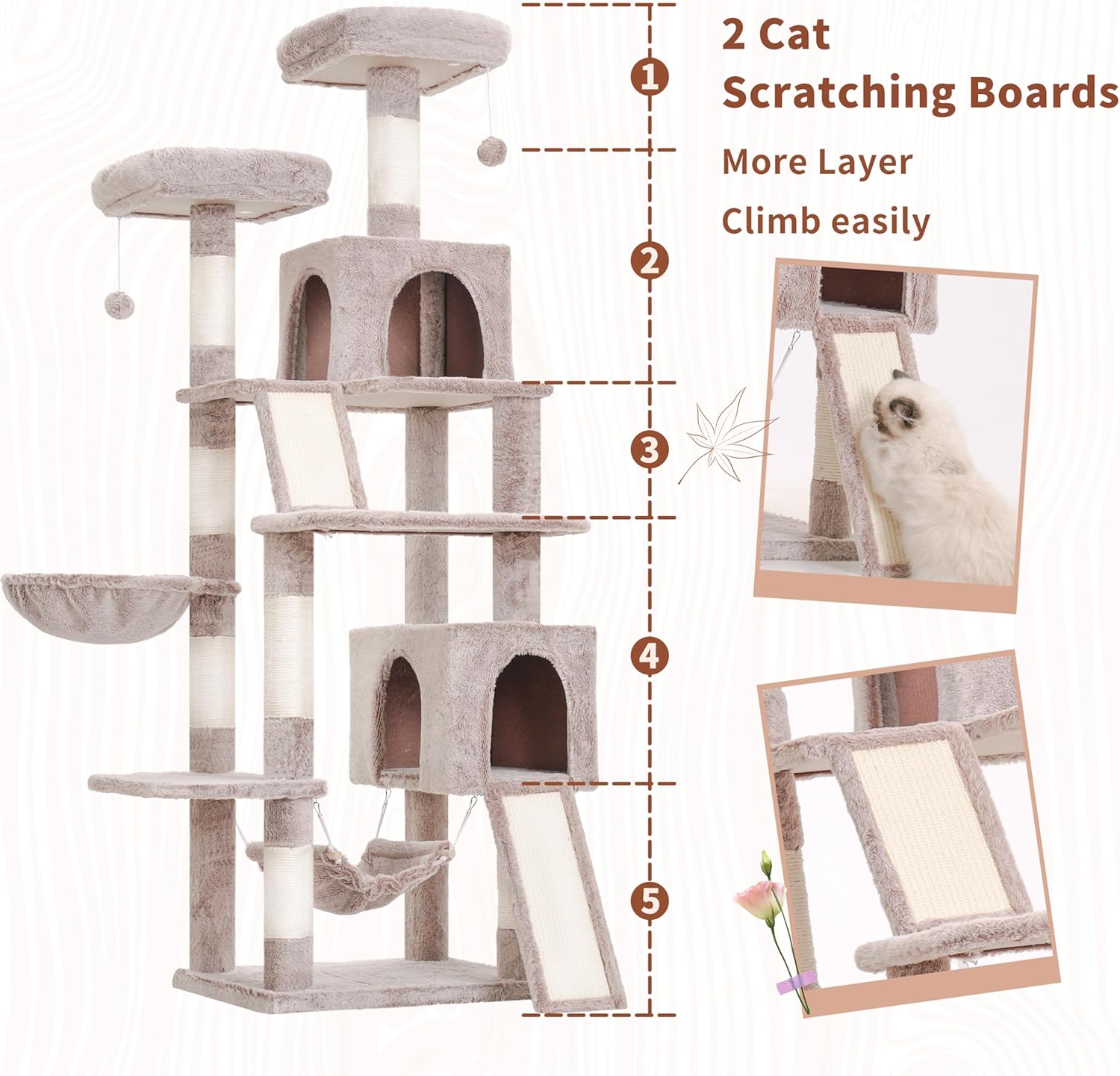 • Multi-level Tall Cat Tree: The design of two independent sisal scratching boards and the platform design for each layer make this cat tree have distinct layers and a reasonable structure. Even kittens and senior cats can climb it with ease.