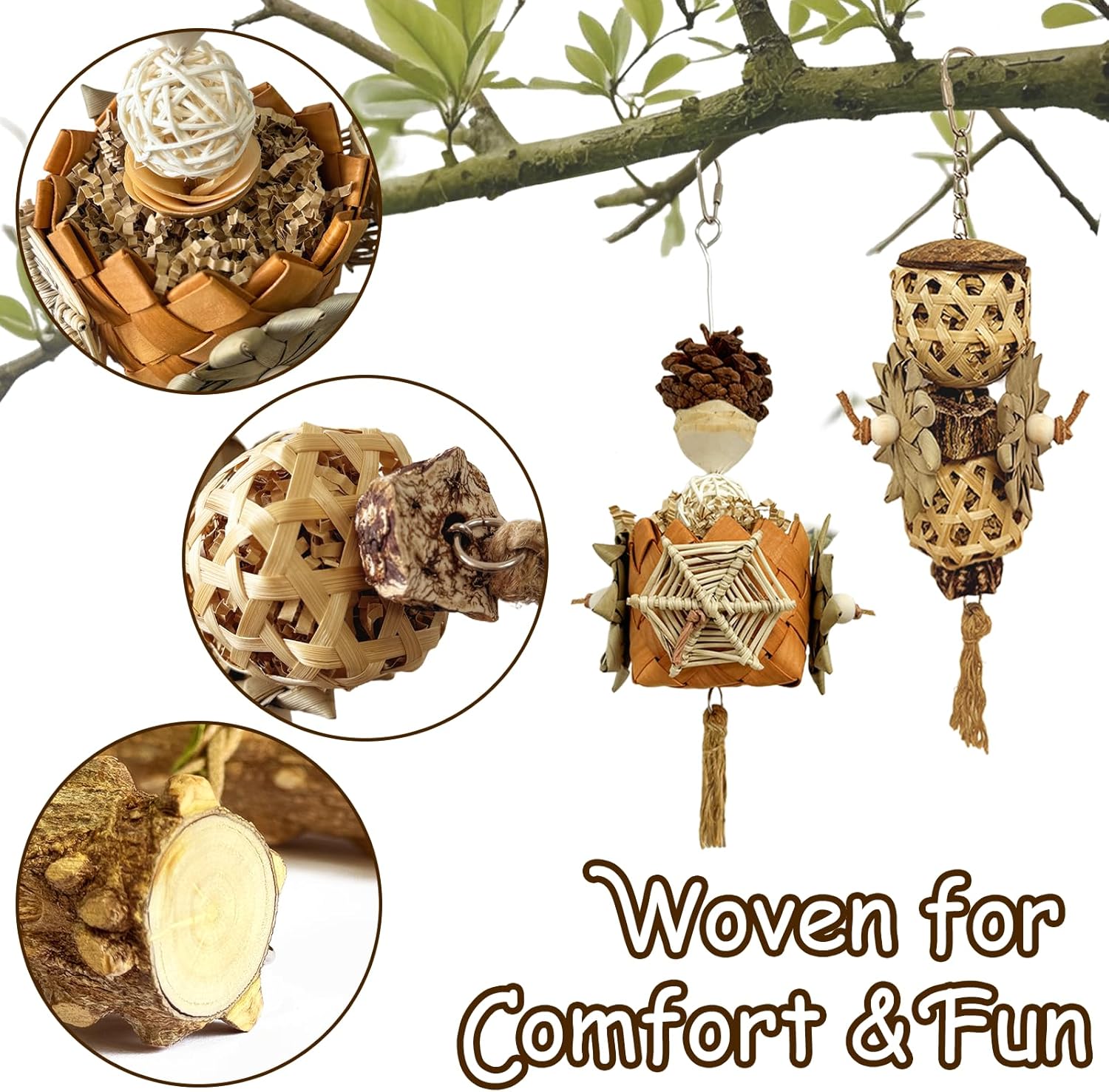 • Natural and Safe Materials: Crafted from non-toxic, natural materials like bamboo weaving, flower pepper wood, rattan balls, corn husks, and wood beads, providing a safe and enriching experience for your feathered friends. Perfect for parrot toys, cockatiel toys, and conure toys.