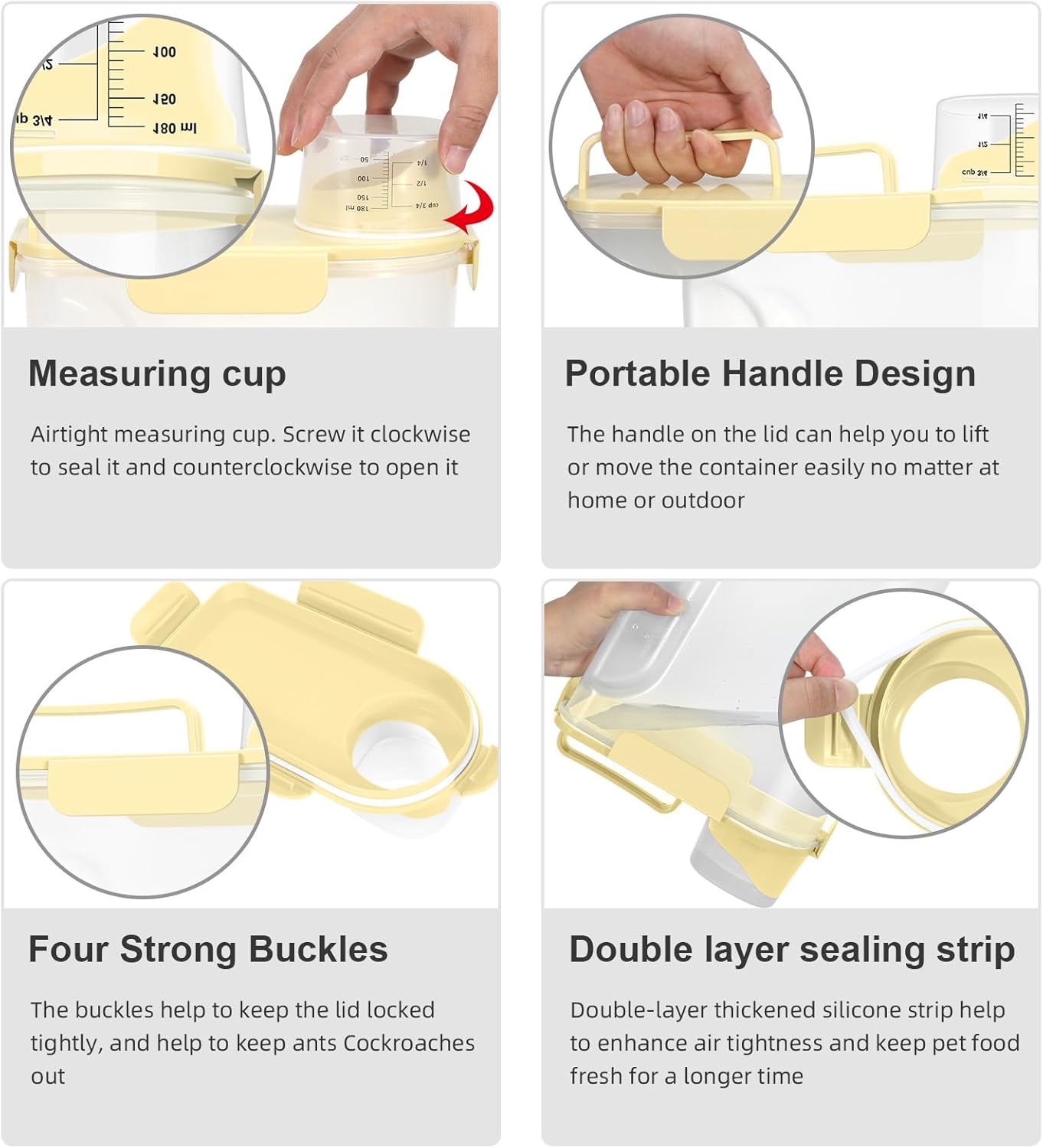 - MULTI-PUrRPOSE STORAGE:Our pet food container is suitable for storing dog food、cat food、bird seed、fish food、rice、 dry food、cereals、oats、cat litter 、flour and other large and small grains, as well as washing powder used at home. It is also a good choice.