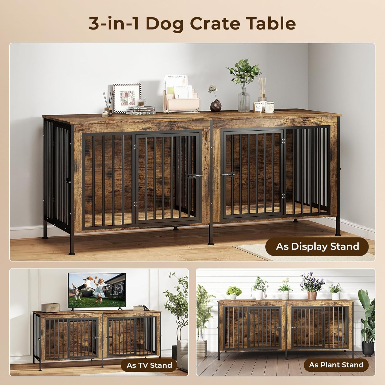 - Multifunctional Dog Crate Table: This dog kennel indoor combines function and style for a chic piece of furniture. Its rustic wood grain and clean lines fit perfectly in a living room, bedroom or entryway and can be used as a TV stand, side table or decorative ornament while saving space