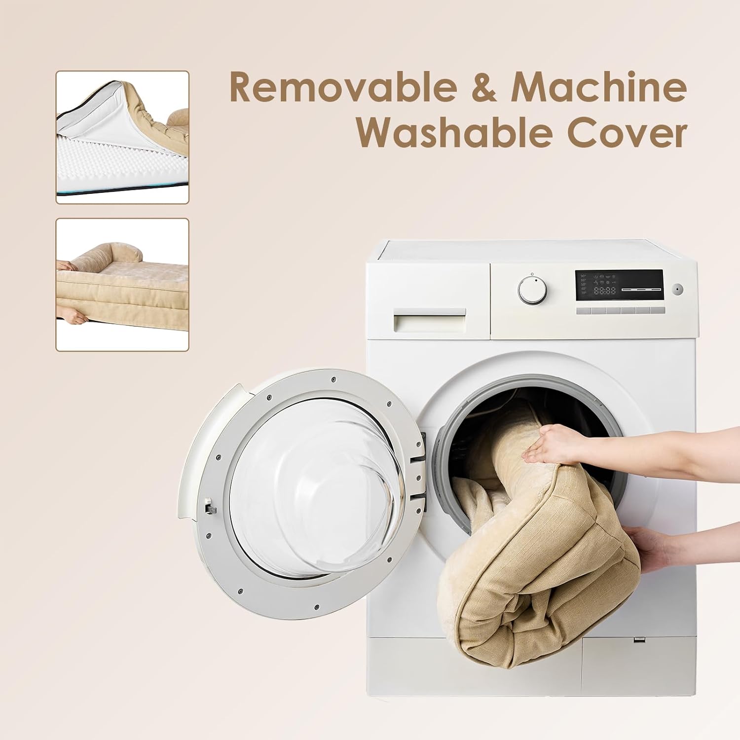 - CARE INSTRUCTIONS: Our dog bed features a removable and washable cover with a zipper closure, making it easy to clean. Remove the foam insert, and the cover can be washed in a machine. Please note that the foam insert is not washable. Allow the bed to expand for 24-50 hours after unpacking.