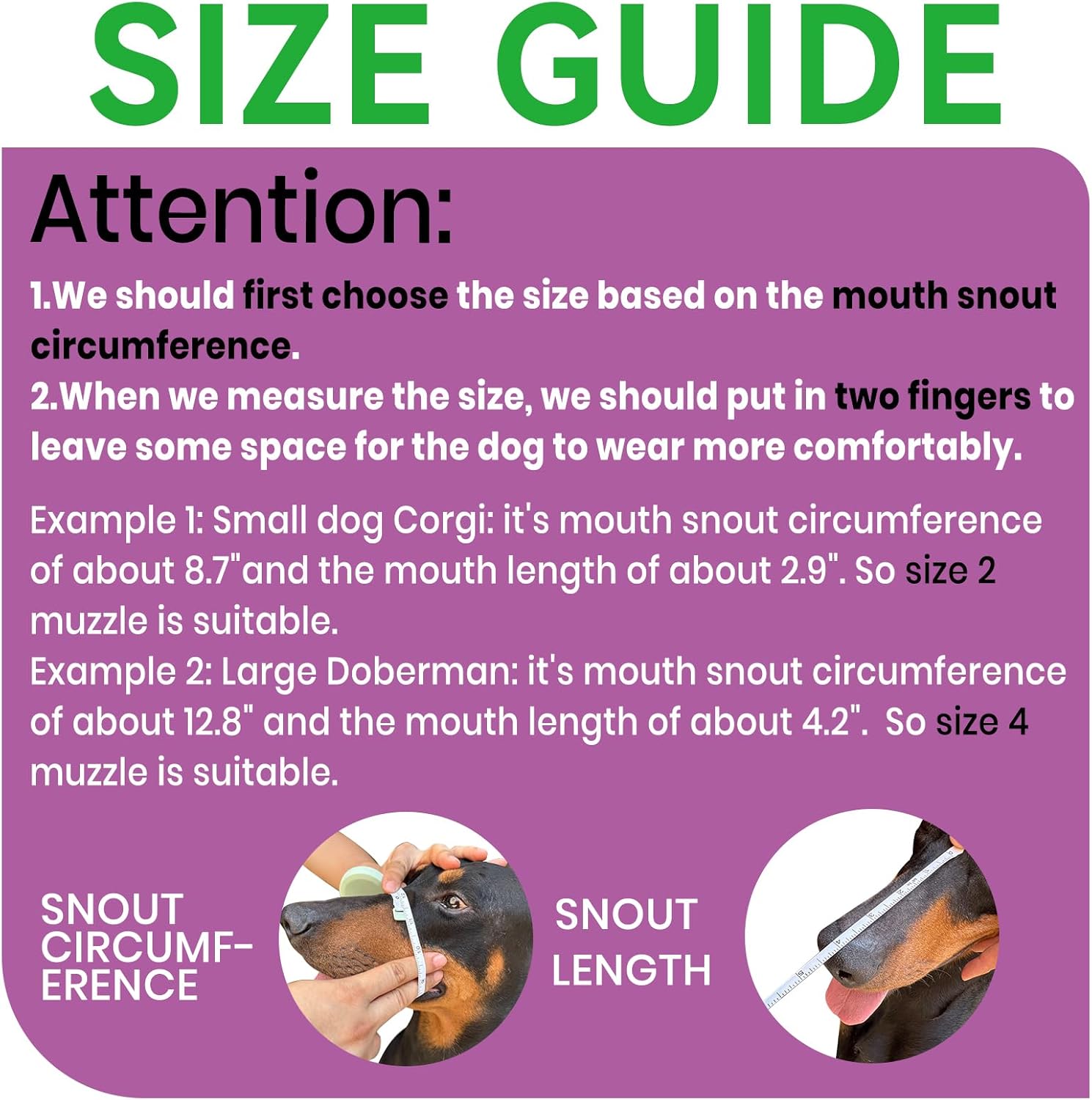 - PLEASE MEASURE BEFORE BUYING:Measure both snout circumference and snout length before purchasing. If your dog's snout length exceeds the size range by about 1 inch, choose the next size up. For long-snout breeds like Dobermans, make sure the snout length fits as well.