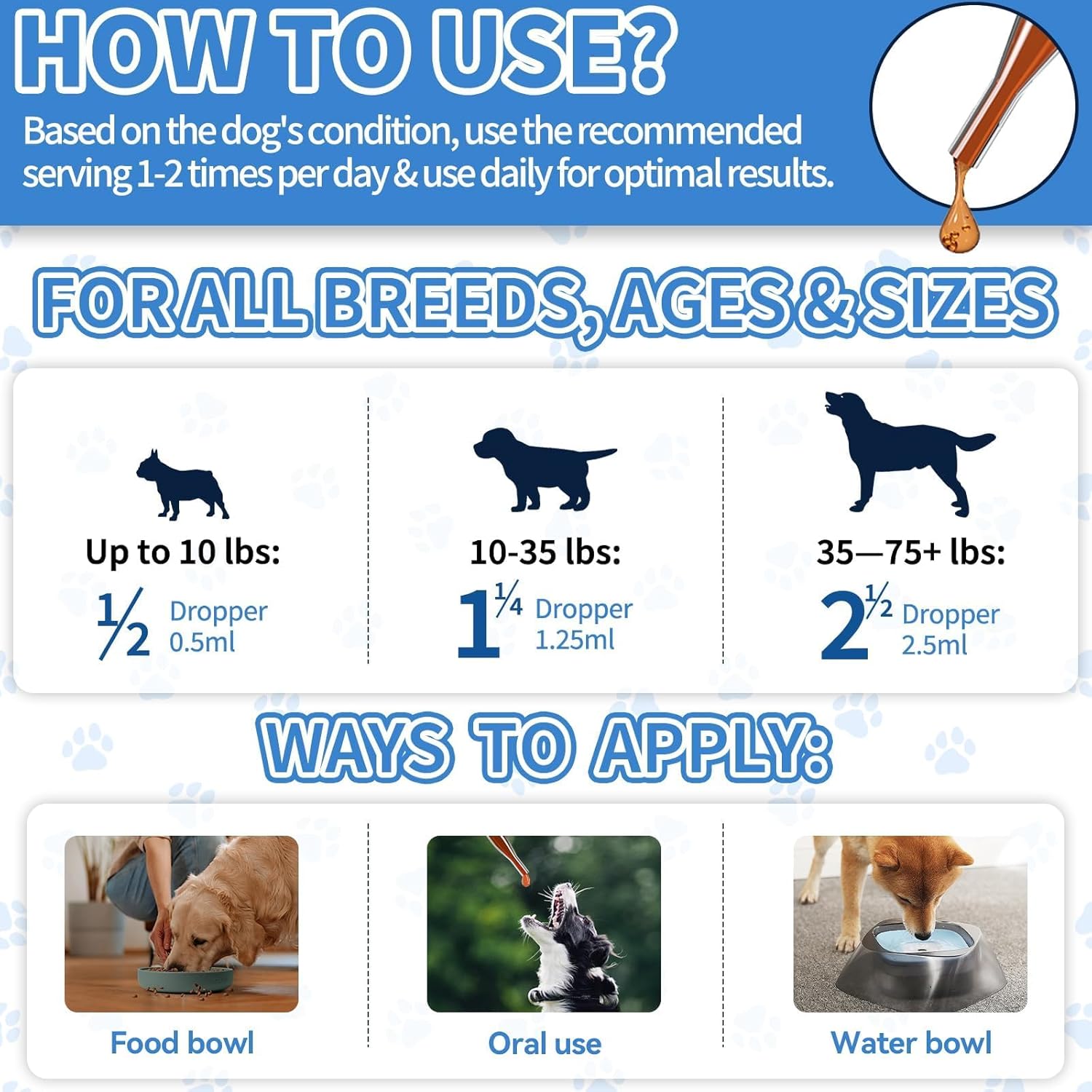 - Chicken Flavor - Suitable for All Ages, Breeds & Sizes: A popular choice among pet owners, our herbal wellness drops offer gentle support for small, medium, and large dogs. Our product features delicious chicken flavor dogs love! Simply mix into food, water, or administer directly. For ongoing support, use daily based on weight: Under 10 lbs: Β½ dropper (0.5 ml), 10-35 lbs: 1ΒΌ droppers (1.25 ml), Over 35 lbs: 2Β½ droppers (2.5 ml).