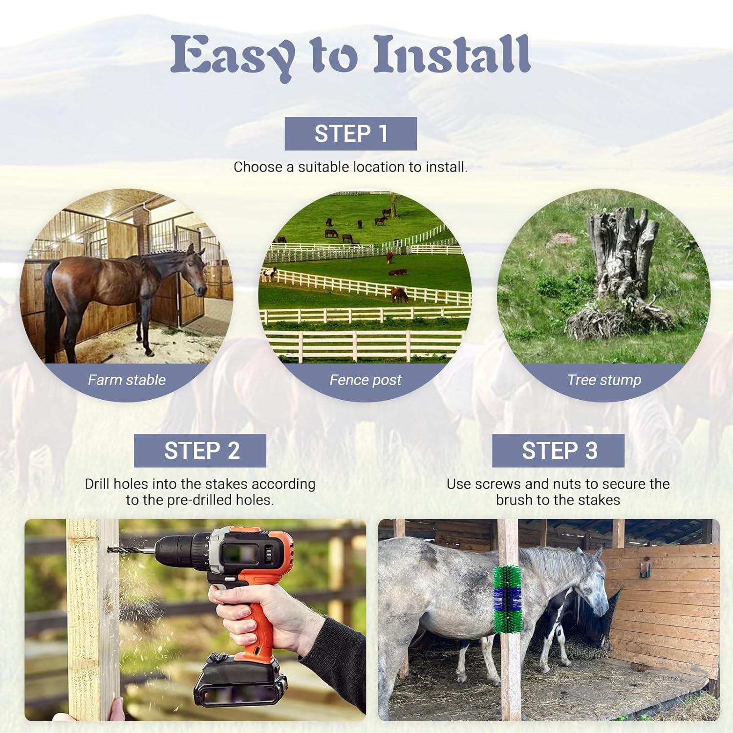 - Easy to install/disassemble, This goat brushes for grooming includes 1 brush and 4 screws. It can be installed in barns, pastures, livestock fences, horse sheds, trees, walls, or anywhere outdoors, and it is also easy to dismantle if you need to demolish it.