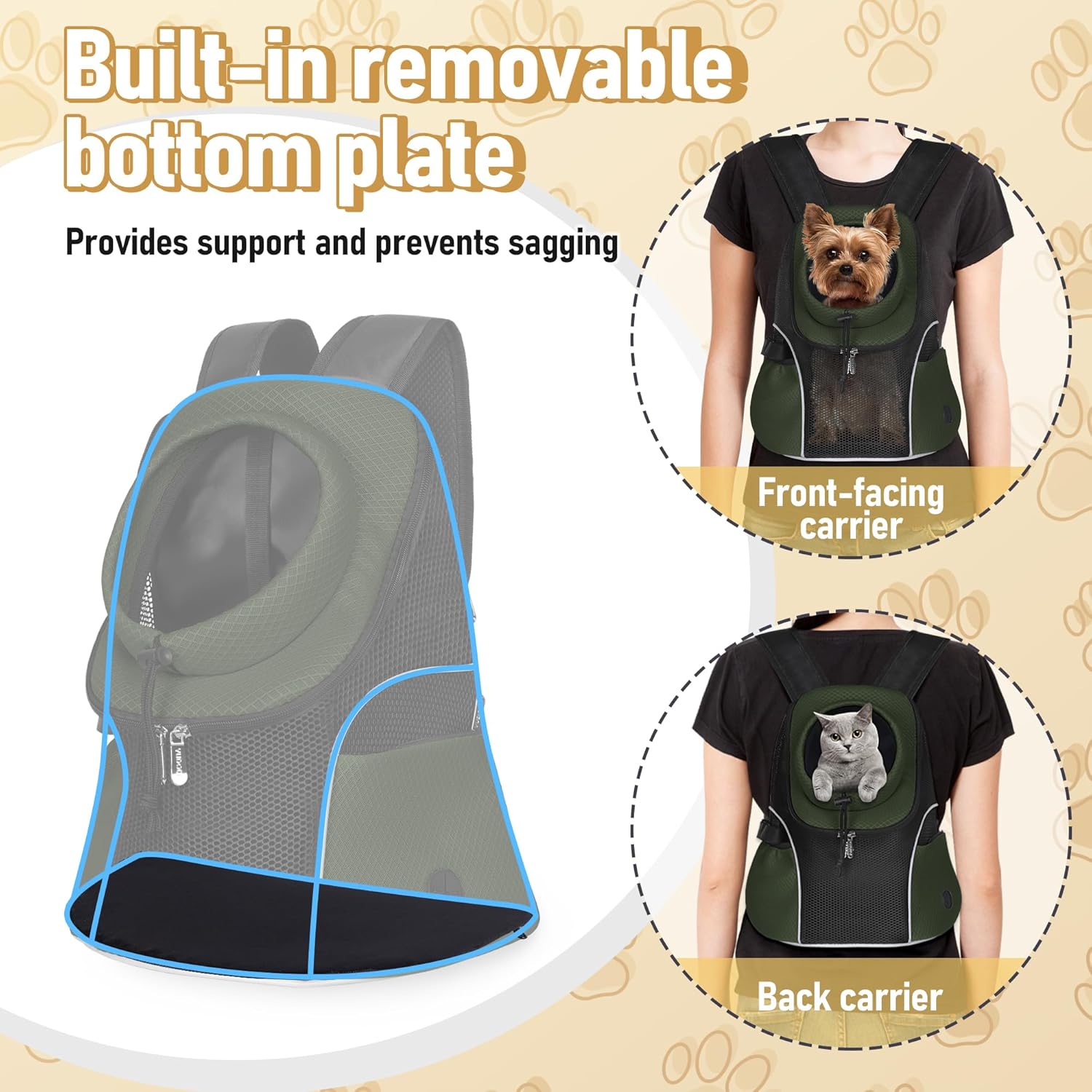 - 2 Ways of Wearing: You can wear the WOYYHO hands-free dog backpack on the front or back. The straps are ergonomically designed to ease the burden on the owner's shoulders and back. The hip belt and sternum strap provide additional support and prevent falls. Internal removable baseplates provide stability, added comfort, and are easy to clean