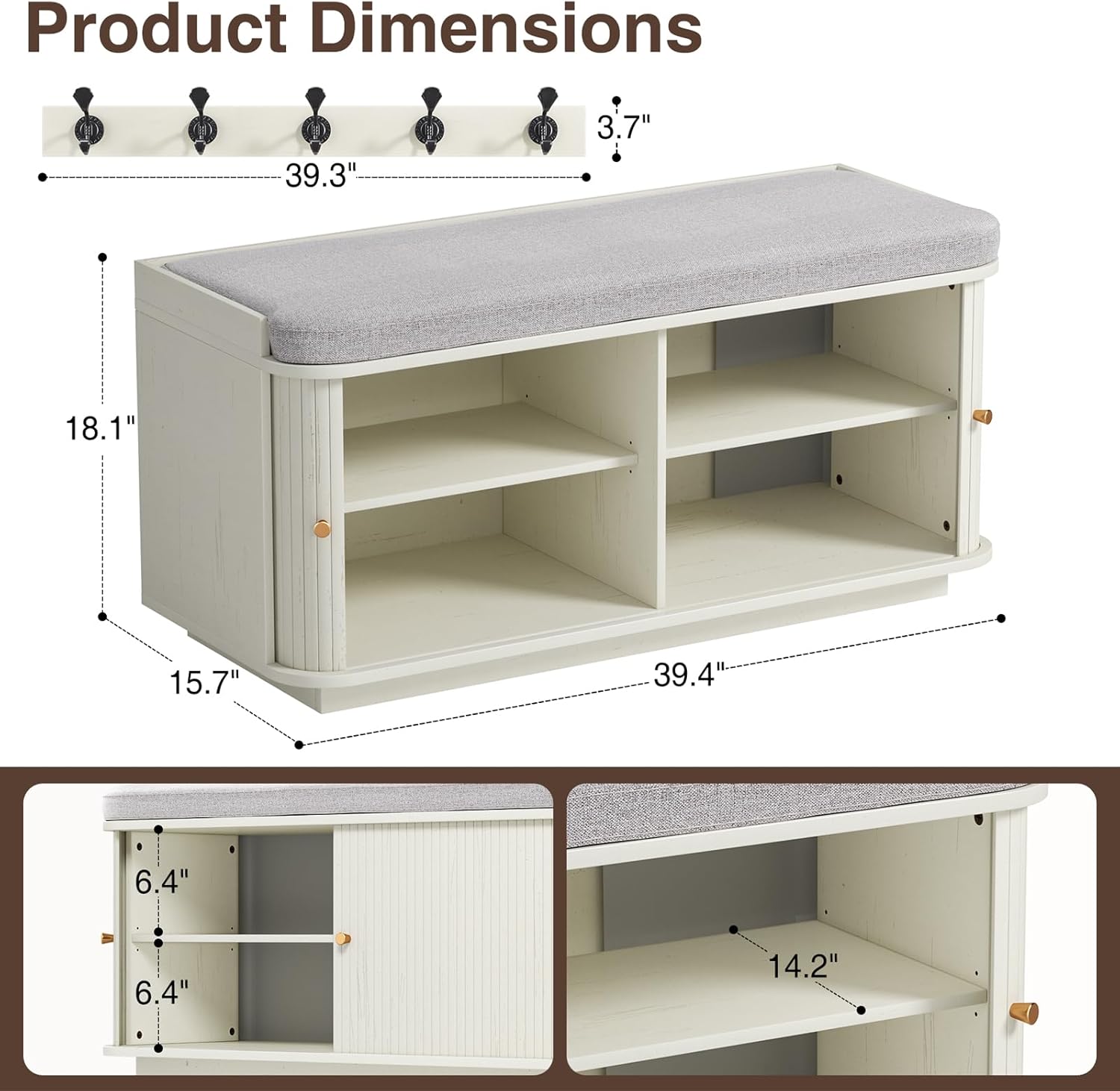 Cream White 39.4" W 2-Tier Shoe Bench with Storage | Entryway Bench with Padded Cushion, Sliding Doors & 5 Hooks