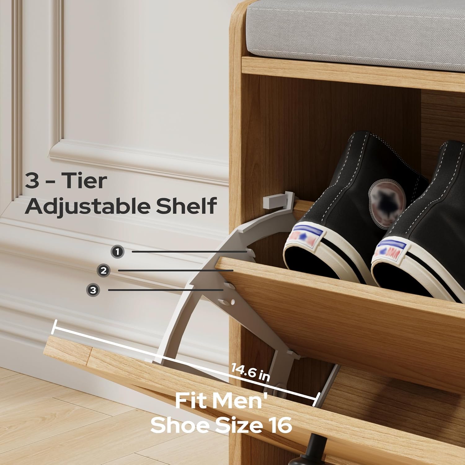 - Flexible Shoe Storage Space: With an adjustable and removable shelf in the drawers, this entry bench allows you to customize the space for different types of footwear. Whether itβs slippers or sneakers, our farmhouse shoe bench ensures that all your favorite shoes have a dedicated home