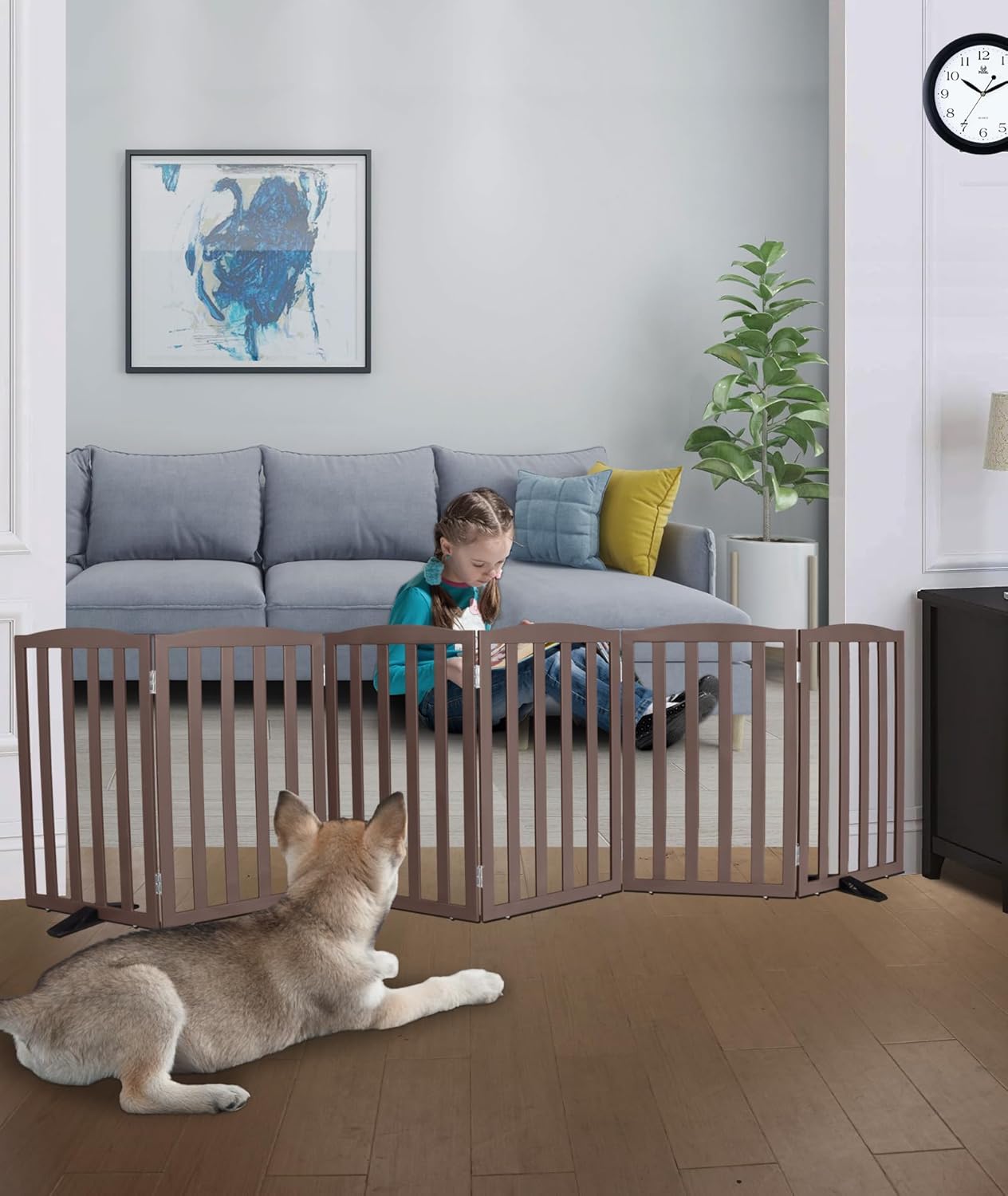 ZJSF Foldable Freestanding Indoor Dog Gate for House Wood Long Pet Gates Dog Fence for Stairs Puppy Gates for Hallways, Puppy Gate,Support Feet Included, Brown, 32 "Height-6 Panels