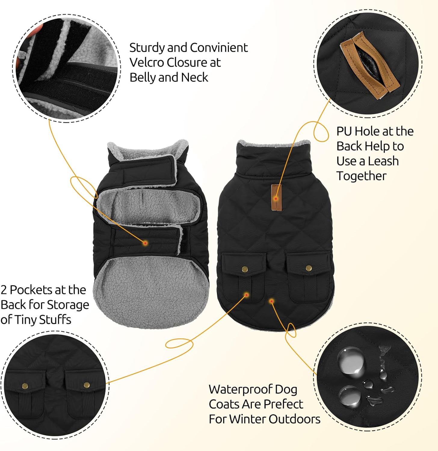 • ULTRA WARM COLD WEATHER DOG JACKET - The thick and warm winter dog coat is made of soft windproof polyester with polycotton quilting workmanship and the lining is made of heavy short plush polyester sherpa. The warm jacket can company your dog come through this cold winter.