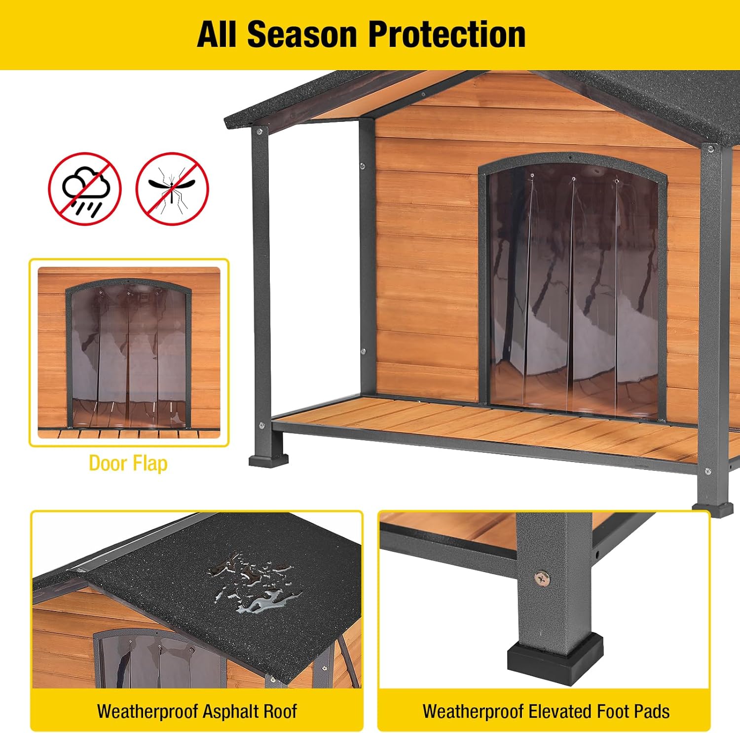 • All-Weather Asphalt Roof: The sloped asphalt roof ensures this dog house stays dry inside, protecting your pet from rain, snow, and harsh sunlight