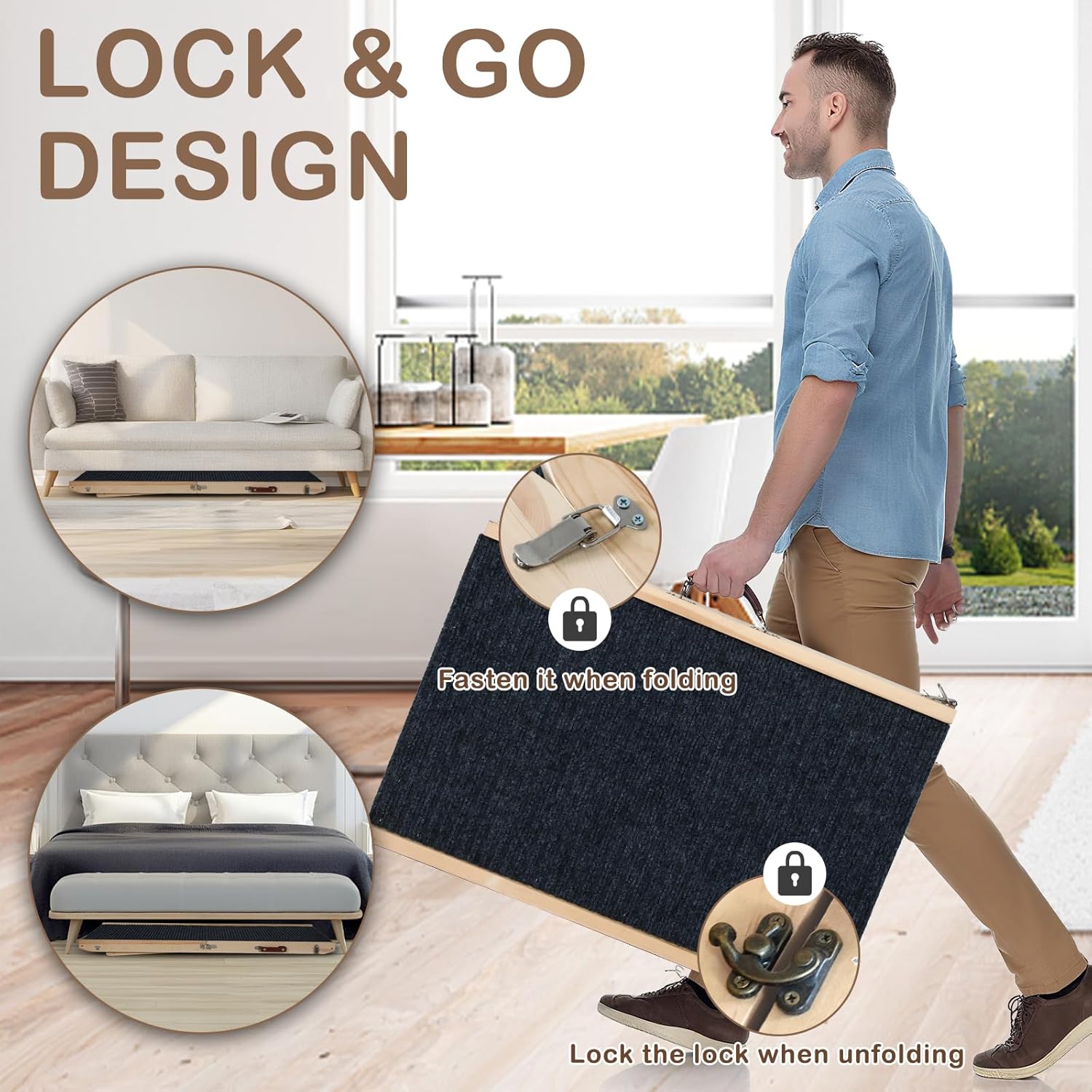 - Portable & Foldable Design β Lightweight and collapsible construction makes this ramp easy to carry, store, or travel with; ideal for on-the-go pet owners seeking convenience.Couch pet ramp can be fixed with different locks both before and after folding, and the operation is simple.