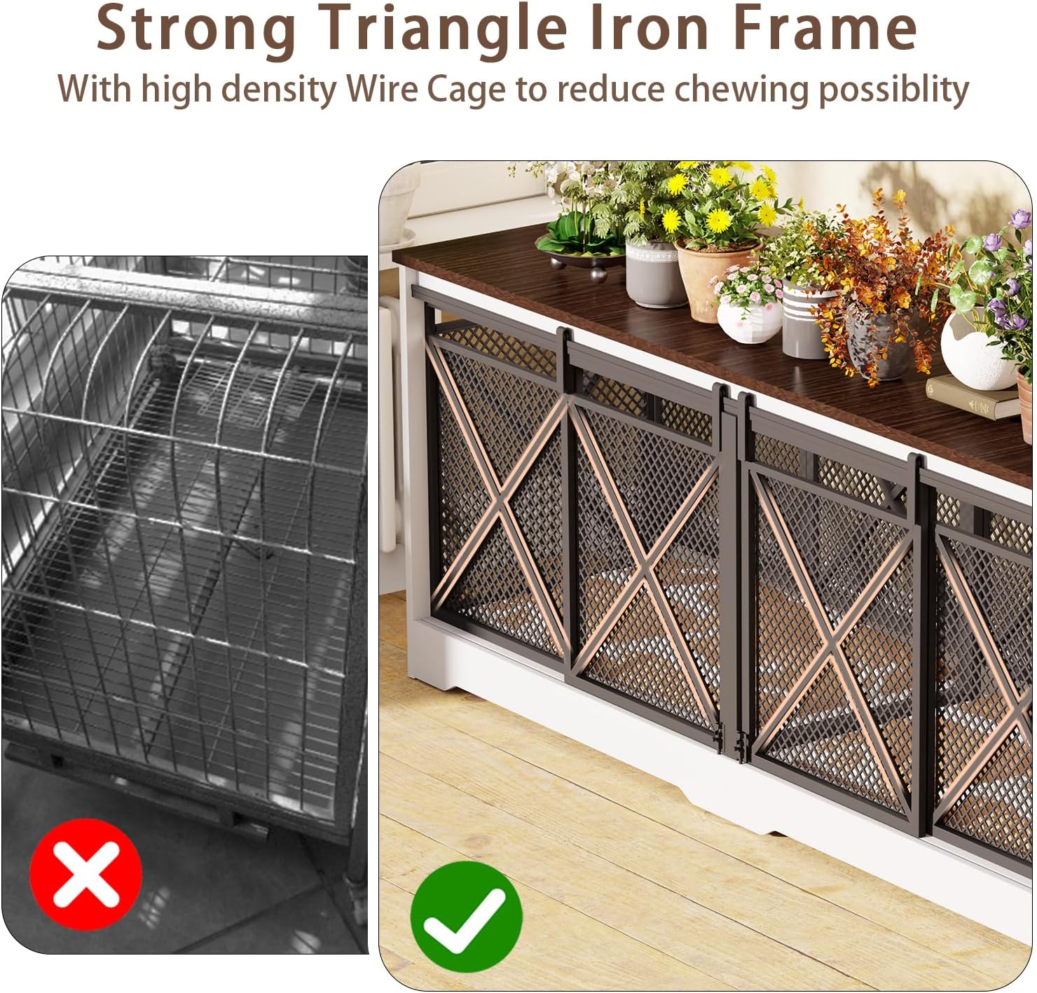 - 🐾【Chew-Resistant & Sturdy】 This dog crate furniture is built with heavy-duty metal and premium wood, featuring a excellent quality metal coating for safety. The reinforced wood-iron structure enhances chew resistance while providing comfort, durability, and easy maintenance. The bottom wooden board offers stable support, protecting your pet’s paws from injury.