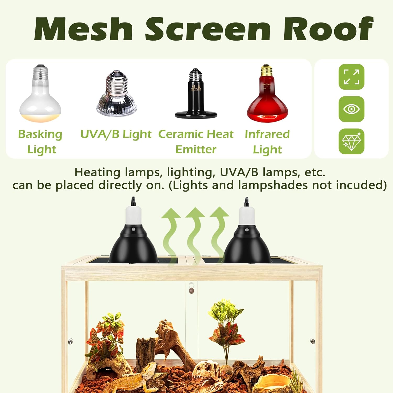 • 【Smart Design for Comfort & Security】The front features double sliding glass doors with a secure lock for easy access and peace of mind. A sturdy metal mesh top ensures proper ventilation and is compatible with heat lamps or UVA/UVB lighting setups (not included), helping maintain the perfect conditions for your reptiles.