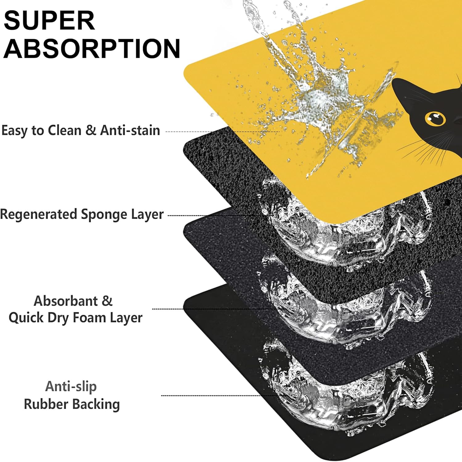 • Super Absorbent & Stain-Resistant:Made with ultra-absorbent fabric, this pet feeding mat quickly soaks up water, milk, or food spills, keeping the area around bowls clean and dry. Say goodbye to wet paw prints and sticky residues—perfect for messy eaters and playful drinkers.