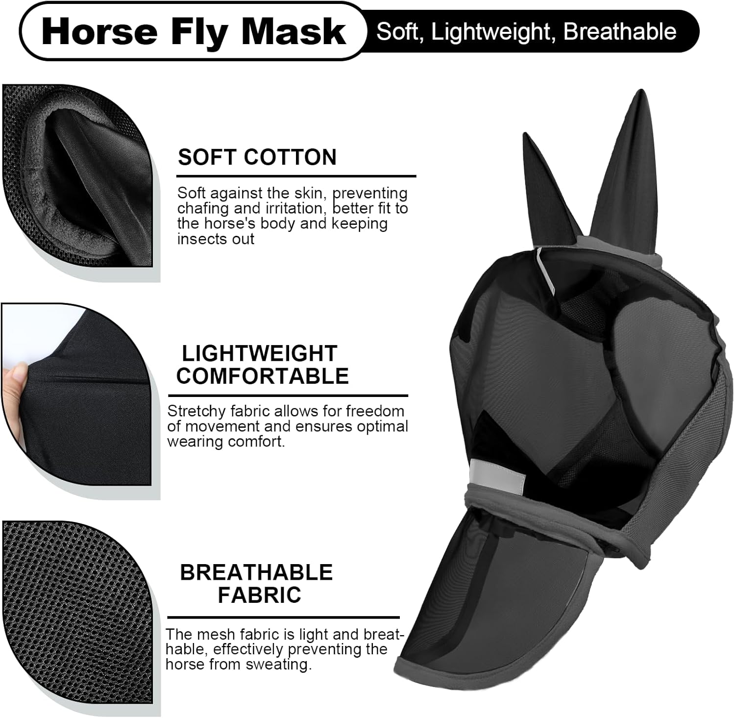- 【High-Spec UV & All-Scenario Pest Defense】 Our lab-certified horse fly mask, an anti-fly mesh horse mask with UV protection, blocks 60%-90% of UV rays. This fly mask for horses shields light-skinned or blue-eyed horses from sunburn and infections. The dense micro-mesh of our fly mask covers face, eyes, ears, and nose, fending off horseflies, ticks, and pollen. Suitable for grazing to riding, our fly masks for horses with ears—including pony and mini horse options—ensure all-scenario protection.
