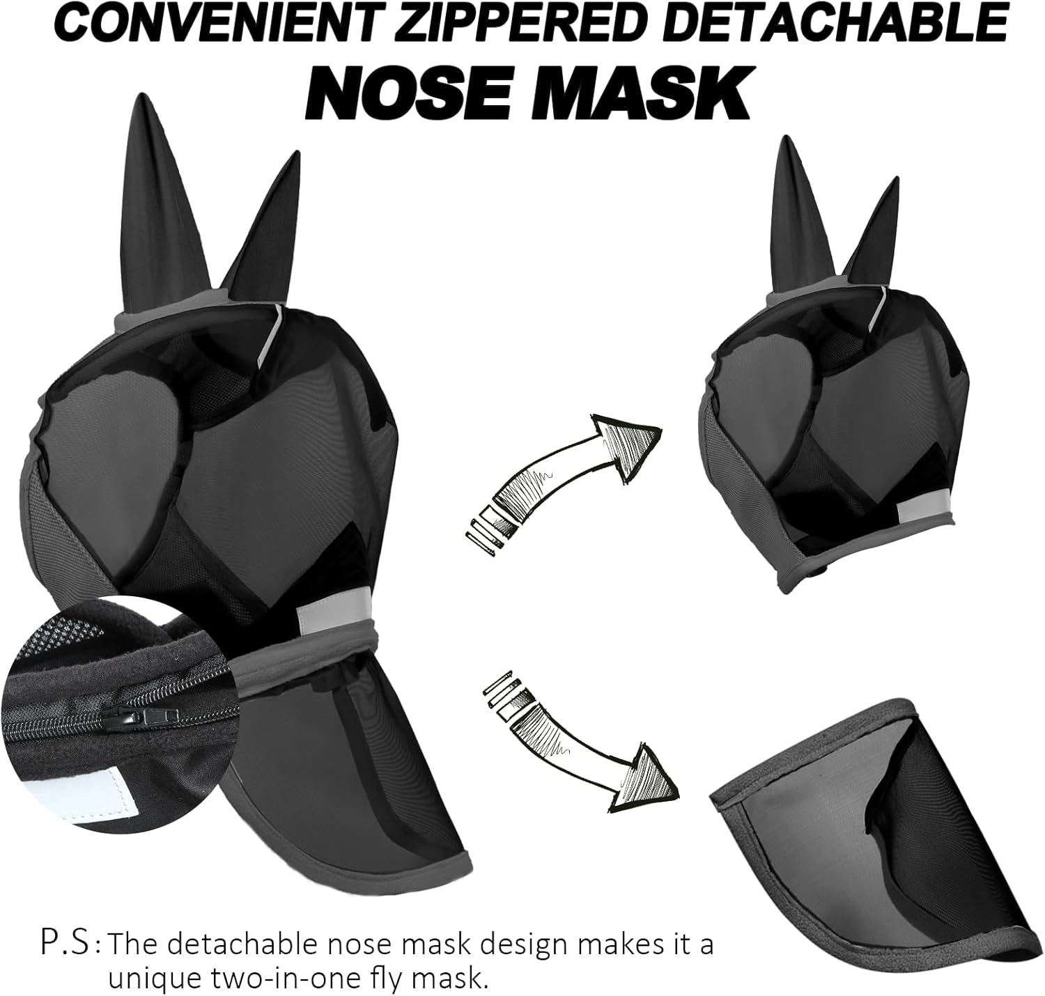 - 【Detachable Nose Flap & Practical Hook-and-Loop Webbing Design】 The detachable nose flap on our fly mask with nose cover adjusts via hook-and-loop for seasonal needs, ideal for shared use among horses and donkeys. Elastic hook-and-loop straps secure our professional choice fly mask in single L size, fitting standard horses. Available in styles like fly masks for horses with ears, it prevents slippage during any activity, balancing functionality and convenience.