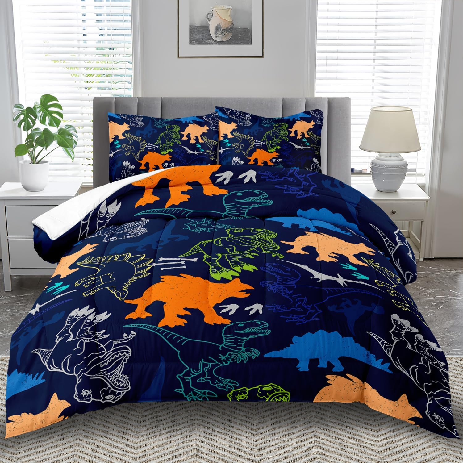 - King Size Blue Cartoon Dinosaur Comforter Set :This bedding set includes 1 comforter(67" x 85") and 2 pillowcases(20”x30”). In order to facilitate transportation, the quilt is made of vacuum compression technology. It will be slightly wrinkled when taken apart, but it will quickly regain its fluffiness if you gently beat it.