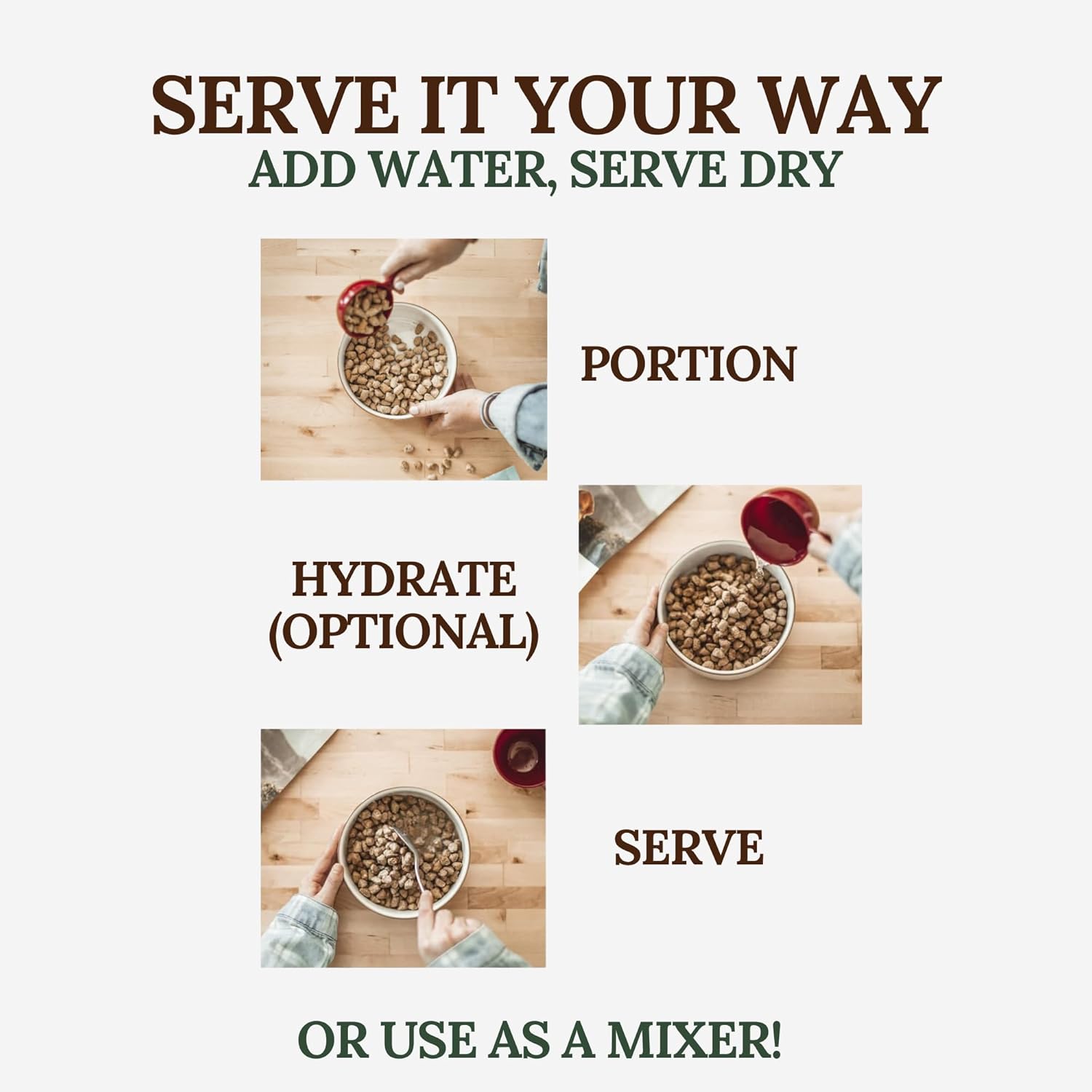 • Serve as a Meal or a Topper – Use as your dog’s complete meal or sprinkle over their usual food for added variety and taste. If using as a topper, reduce the amount of their current food to avoid overfeeding.