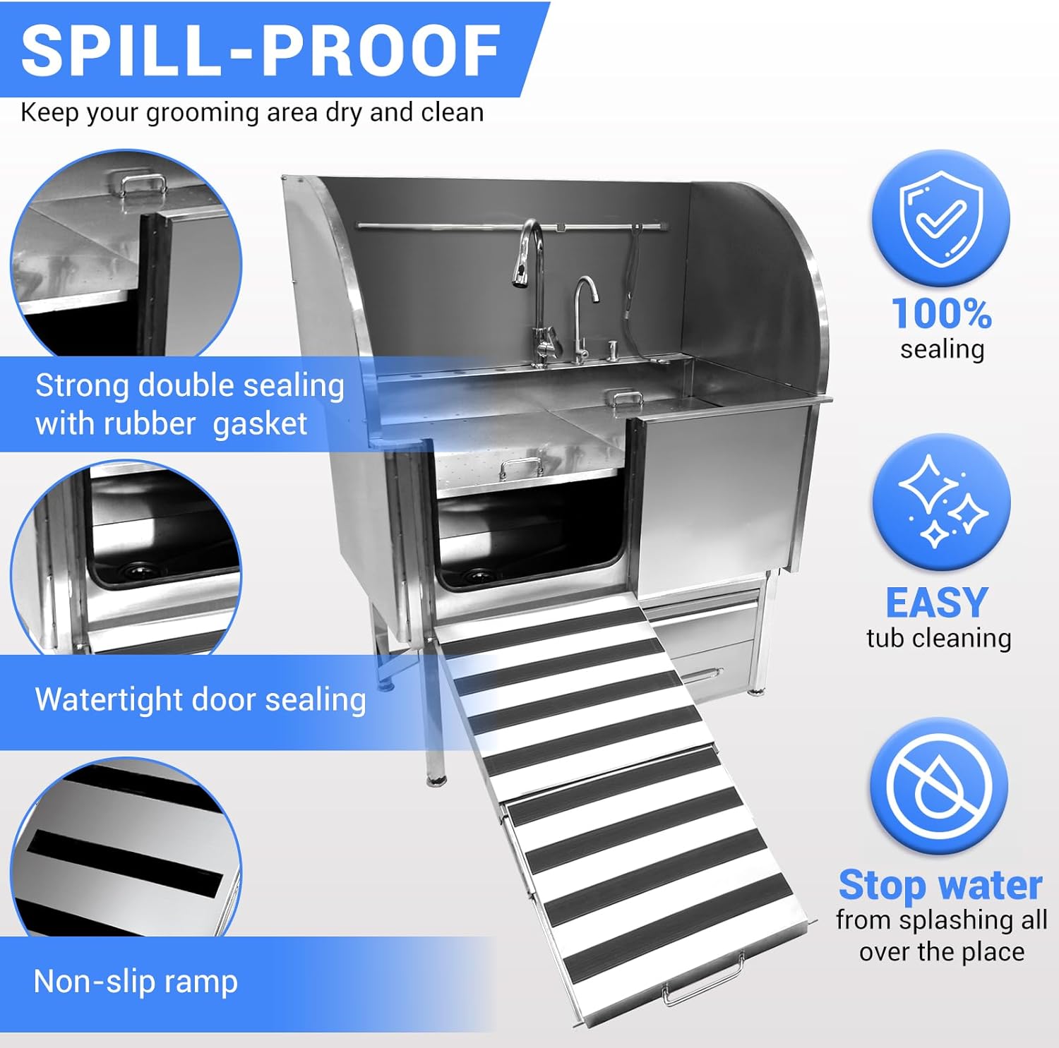 • Spacious Tub with Smart Storage: 38”x30.7”x58.7” size fits all dog breeds. Includes a large sliding drawer to organize towels, shampoos, and grooming tools for a clutter-free bathing area.