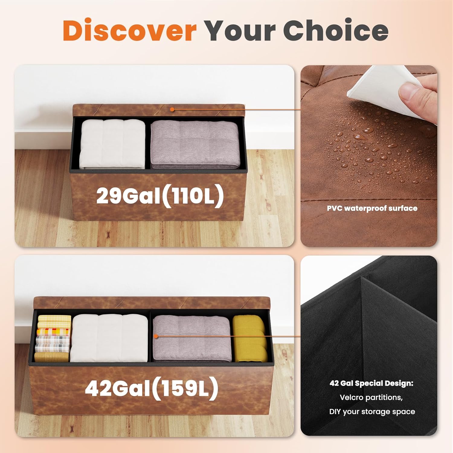 - ăPremium & Durable BuildăThe black Sweetcrispy storage ottoman features chic Lychee Grain Leather, while brown uses sleek Synthetic Leatherâboth super comfy and built to last. No flimsy stuff here! We use 4 layers of reinforced material with 9mm-thick edges, supporting up to 660 lbs without extra nails. Just sturdy Sweetcrispy quality!