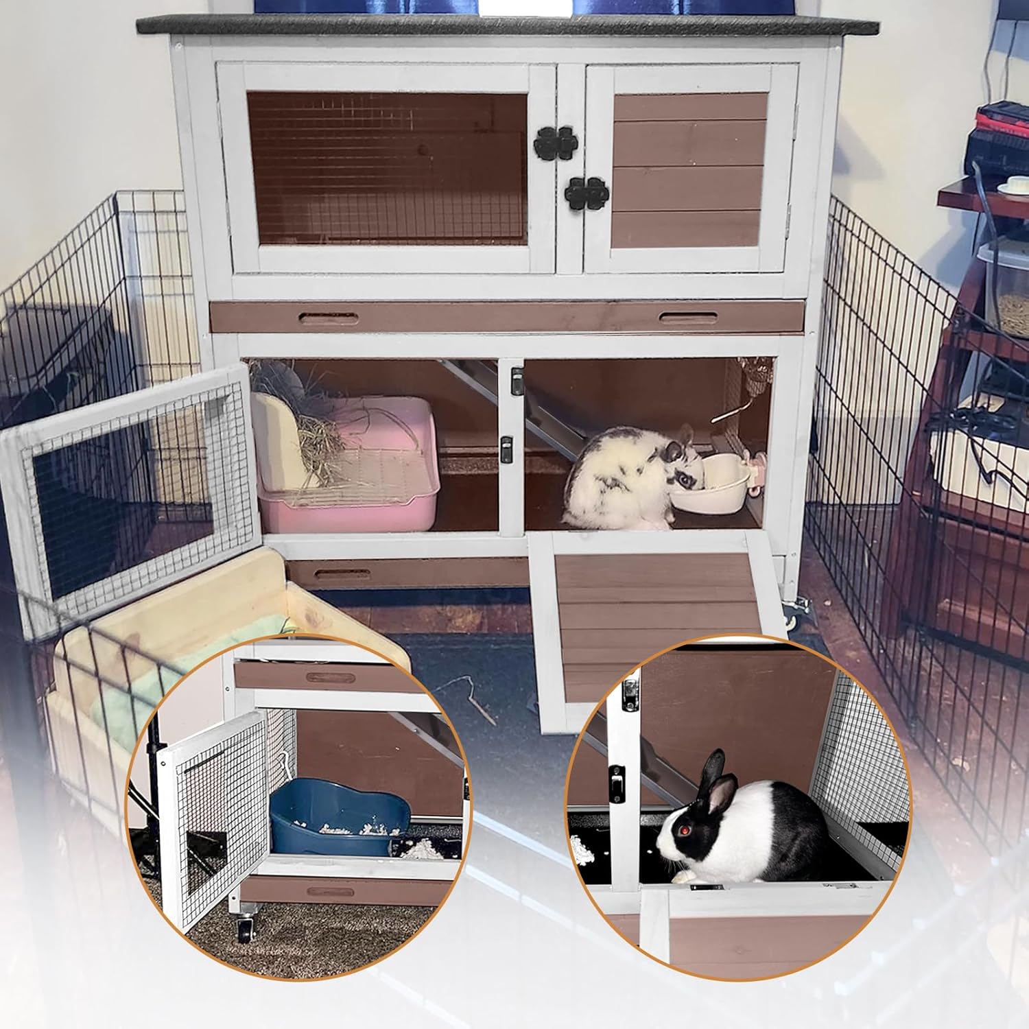 Rabbit Hutch Indoor Outdoor, Bunny Cage with Casters, Guinea Pig Cage Bunny Hutch with Two Plastic Trays 36inch-Brown