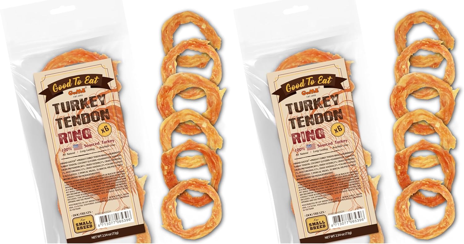 Gootoe Turkey Tendon Dog Treats, Ring (S) 6 Pieces per Pack, USA-Sourced Turkey Tendon, Natural Snack, Premium Puppy Chews, Hypoallergenic, Reseal Value Bags, Size for Small Dogs (Pack of 2)